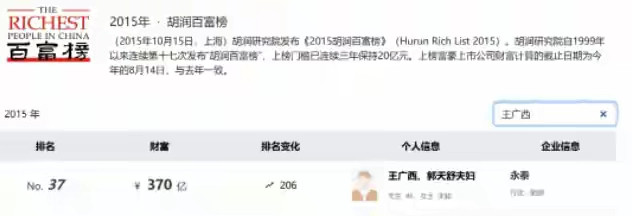 王广西曾连续多年登上《胡润百富榜》,在2015年达到人生高光时刻,与妻子郭天舒以370亿元身家登上胡润百富榜37位。