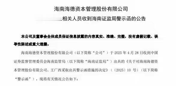 今年4月底,海南证监局就曾对海德股份和王广西采取出具警示函的措施。海南证监局监管发现,海德股份在债权投资及困境资产收购业务中存在被控股股东或其关联方占用资金的情况且未按规定予以披露。