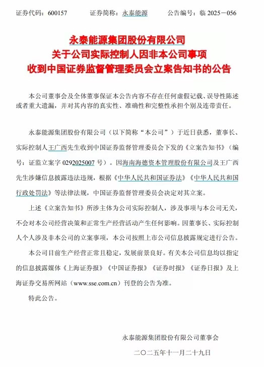 永泰能源在公告中明确表示,本次立案所涉主体为公司实控人,涉及事项与公司无关,不会对公司经营决策和正常生产经营活动产生任何影响。