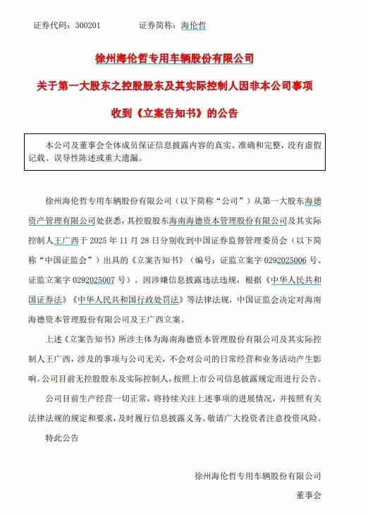 这场风波的核心指向了王广西实际控制的海德股份。海德股份在当晚的公告中坦承,因涉嫌信披违法违规,证监会决定对公司及实控人王广西进行立案调查。