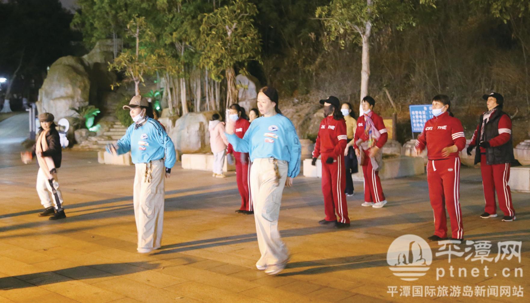 华灯初上,位于平潭西航路与金井湾大道交会处附近的万宝公园开始热闹了起来。开阔的广场区域,已然成为夜间群众文化活动的聚集地。